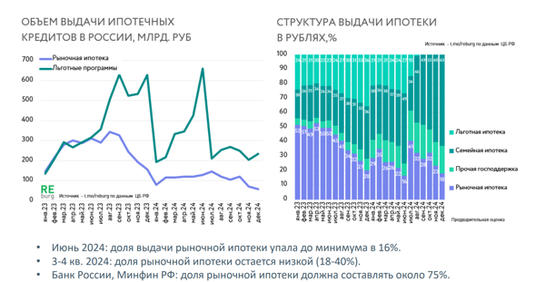 Гораздо сложнее ситуация у застройщиков, которым надо продавать большой объем квартир. В первой половине 2024 года ежемесячно продавалось 6% от выставленного на продажу строящегося жилья, во второй половине года уже всего лишь 3,5% квартир. Но даже этот показатель не является критичным для рынка: все квартиры, выставленные сегодня на продажу, можно будет реализовать за два с небольшим года. Это неплохая цифра, так что я призываю не преувеличивать масштаб трагедии на рынке новостроек.