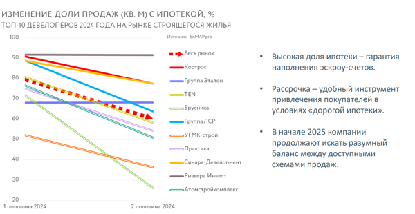 Доступность и популярность ипотеки для покупки нового жилья тоже снижается. Доля сделок с ипотекой на первичном рынке в первой половине 2024 года была 80%, во второй половине она упала до 59%. А предварительные данные за январь 2025 дают цифру около 42%. В этих условиях застройщики ищут варианты стимулирования спроса. Логичным ответом на изменение рынка стал стремительный рост собственных программ рассрочек. Это компромисс и, пожалуй, один из немногих возможных путей развития рынка.