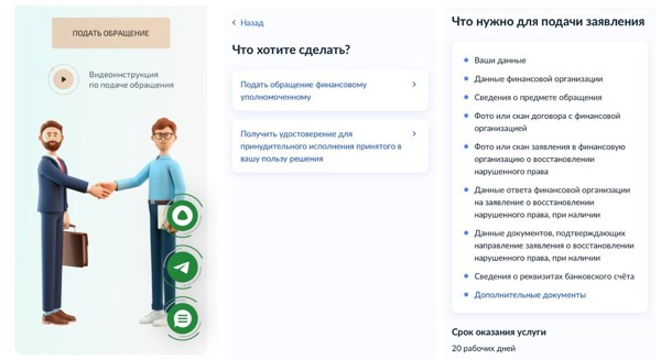 Если вы не согласны с ответом или не получили его вовсе, пишите обращение финансовому уполномоченному. Сделать это можно на сайте финомбудсмена или через Госуслуги. К электронному обращению необходимо будет приложить сканы документов, например, копию заявления (претензии) и договор с банком. Список нужных бумаг вы увидите в личном кабинете.