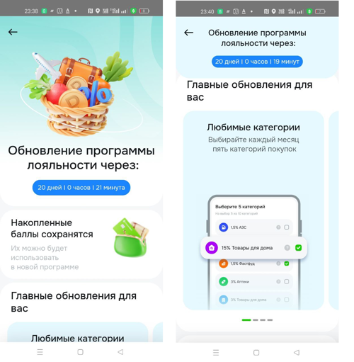 2. Каждый месяц с 25 числа нужно выбирать 5 категорий с кэшбэком до 15% на следующий месяц. Категории выбираются в разделе «Баллы» в мобильном приложении банка. Если категории не выбраны до начала месяца, их можно выбрать в течение месяца. Баллы начнут начисляться за покупки, сделанные со дня, следующего за днем выбора. Изменить категории после подтверждения выбора нельзя.