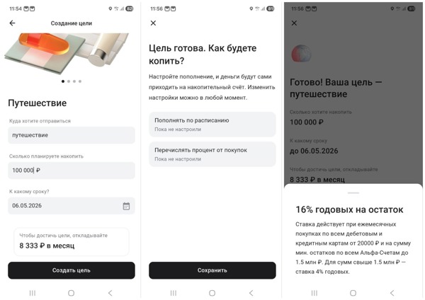 Большой плюс накоплений с помощью целей в том, что банк готов добавить дополнительный процентный доход. Он может изменяться, в зависимости от разных условий. Так, к примеру, в Альфа-Банке при открытии цели на накопительный счет начисляется 16% годовых, но есть условие по сумме ежемесячных покупок — от 20 тыс. рублей и размеру остатков — не более 1,5 млн рублей.