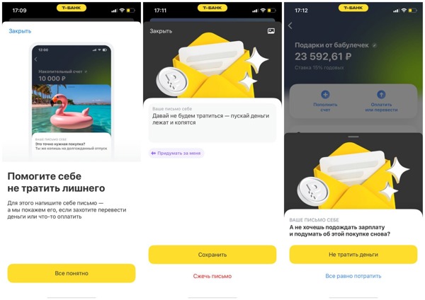 Инструменты для накоплений не всегда завязаны на том, как пополнять счет. Ведь важно еще и не потратить накопленное раньше времени — на импульсивные покупки, например. И тут в дело вступают психологические уловки. Так, например, недавно в приложении Т-банка появилась возможность написать письмо самому себе. Это письмо открывается каждый раз, когда вы собираетесь вывести деньги с накопительного счета. Если нужные слова не приходят в голову, банк может даже написать за вас пару фраз, мотивирующих отказаться от неоправданных расходов.