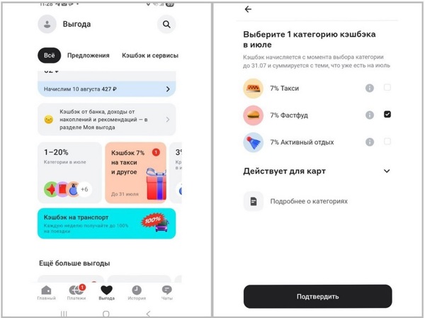 Для выбора дополнительной категории нужно в мобильном приложении банка зайти в раздел «Выгода» и нажать акционный баннер.