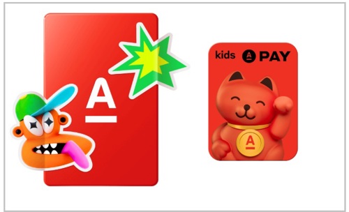 Выпускаются красные вертикальные карты, к которым прилагается набор наклеек. Ребенок сможет создать собственный дизайн карты. Также карту можно выпустить в виде платежного стикера с котиком Дзынь.