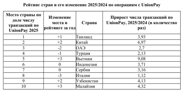 «Сейчас топ-10 стран по числу транзакций по картам UnionPay наполовину формируют государства Восточной и Юго-Восточной Азии: Таиланд, Китай, Вьетнам, Индонезия и Малайзия, а страны Запада утратили позиции. Особенное внимание обращает на себя Китай. На него приходится 20% заграничных транзакций в 2025 году, а если проанализировать август, то видим увеличение числа трат в 4,6 раза год к году. С учётом прогнозируемого роста турпотока на 30-40% после введения безвизового режима мы видим возможности для многократного наращивания числа операций», – заключила Людмила Корсакова.