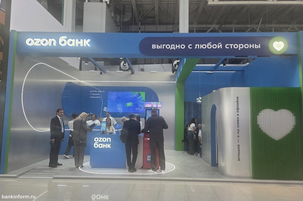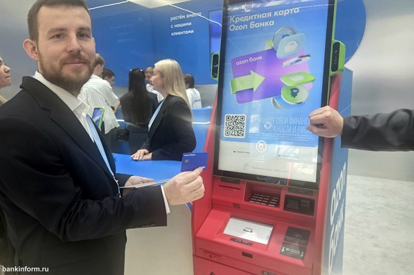 Здесь тоже банкомат, но уже совсем необычный. По сути это картомат: выдает он не банкноты, а карты. Синенькие неименные пластиковые карты, которые раньше можно было получить только при встрече с курьером (напомним, у Озон Банка почти нет офисов). Банкомат вмещает 70 карт. Обещают в 2026 году распространить функционал на всю банкоматную сеть. Впрочем, деньги банкомат выдавать тоже способен, просто на выставке он этим не занимается.