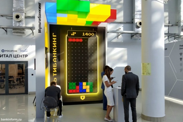 Т-Банк продемонстрировал свою возможность быть везде и сразу: у него на «Финополисе» целых три локации. Есть главный стенд, где посетителям рассказывают про собственный сервис биоэквайринга, предлагают пройти квест и показывают банкомат, узнающий клиента по биометрии. Есть лаунж-зона с апельсинами и мотороллером. И маленький стенд «Мультибанкинг», где через игру в тетрис визуально обыгран новый сервис - добавление в мобильное приложение карт и счетов других банков (в тетрисе складываются жёлтые, красные, синие и зелёные элементы, а какие банки они символизируют, отгадайте сами). Здесь же можно было оформить светящуюся карту.