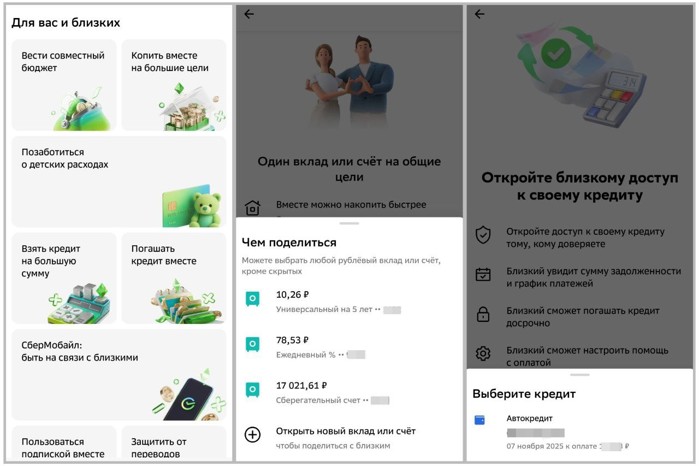 В мобильном приложении Сбера в разделе «Близкие» появились два новых сервиса: открытие доступа к своим вкладам и кредитам другим клиентам. Рассказываем подробнее.