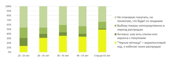 По мере снижения возраста респондентов интерес к распродажам повышается: почти половина (46% опрошенных) в возрасте 26-35 лет не планируют совершать покупки, однако не отрицают, что специальные предложения их могут переубедить. Еще 14% выберут покупки в период распродаж, а у 9% респондентов уже готова корзина для покупок. Только 31% опрошенных миллениалов считают Черную пятницу маркетинговым приемом и избегают участие в акциях.