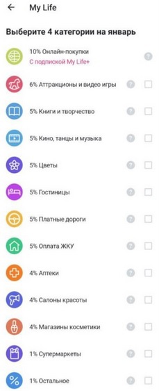 Максимальный кэшбэк может быть доступен при наличии подписки «My Life+» стоимостью 299 рублей в месяц. Также при наличии подписки автоматически подключается категория «Онлайн-покупки» с 10%.
