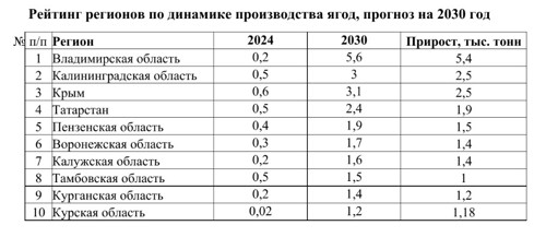 На основании анализа динамики производства ягод и заявленных к реализации проектов ЦОЭ РСХБ совместно с НКО «Союз производителей ягод» составил перечень регионов-лидеров по наращиванию производства в организованном секторе к 2030 году.