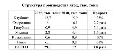 Примечательно, что позитивный прогноз основывается как на расширении посевных площадей, так и за счёт внедрения новых интенсивных технологий, особенно в клубнике, смородине и крыжовнике. В малине и голубике сохранится классический подход к уборке.