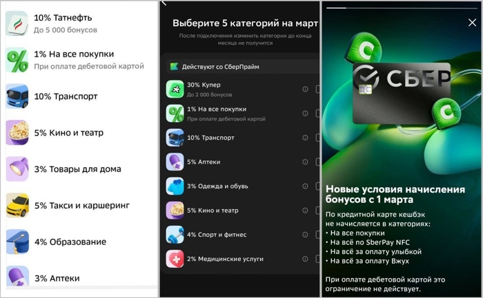 4. Специальные категории: «На все при оплате улыбкой», «На все по SberPay NFC», «На все за оплату Вжух» могут предложить тем, кто не подключал ранее эти сервисы для оплаты покупок. Но с 1 марта также не бонусируются покупки по кредитным картам в этих категориях.