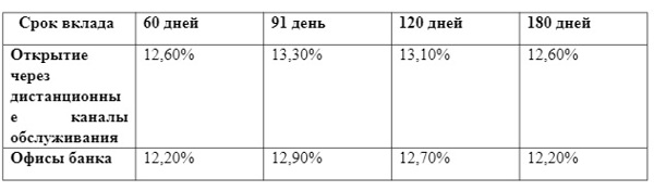 Процентная ставка по вкладу устанавливается в зависимости от выбранного срока размещения и канала открытия. Для участия клиенту необходимо открыть вклад «Свой вклад» (без пополнения и без расходных операций) в рублях на один из следующих сроков: