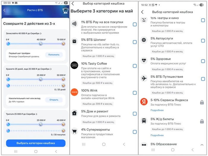 3. Замечены категории ВТБ шоппинг и ВТБ путешествия (авиабилеты) с кэшбэком 5% и с лимитом.