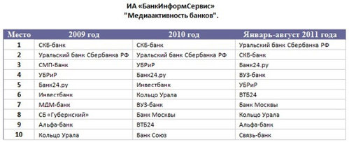 Развитие в Сбербанке федеральной пресс-службы привело к тому, что Уральский банк Сбербанка выходит на лидирующие позиции и смещает постоянного лидера (как мин. 2 года подряд) СКБ-банк. Планомерную и кропотливую работу по расширению присутствия в медиапространсве ведет PR- служба Банк24.ру. Сегодня банк значительно укрепил свои позиции и занял третье место, в 2010 году он был на 4-ом, а в 2009 году - на пятом. Развитие pr-деятельности других участников десятки можно проследить по таблице «Медиаактивность банков».