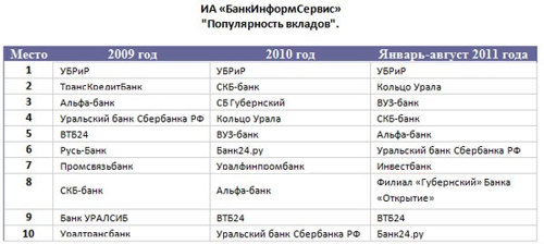 Уральский банк реконструкции и развития все также удерживает первое место, завлекая клиентов выгодными условиями и процентной ставкой вкладов, а также имиджем традиционного, устойчивого, а значит внушающего доверия банка. Банк "Кольцо Урала" и ВУЗ-банк, впервые заявившие о себе в десятке лидеров рейтинга «БанкИнформСервис» «Популярность вкладов» только в 2010 году, сегодня заняли второе и третье места.