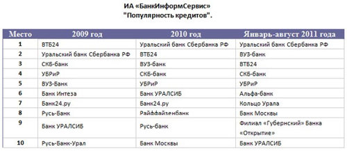 Лидирующую позицию прочно занял Уральский банк Сбербанк РФ, подкупая клиентов привлекательными условиями своих и государственных программ. Второе и третье места поделили между собой, как и в 2010 году, ВТБ24 и ВУЗ-банк. Кто из них окажется на вершине, посмотрим по итогам текущего года, а пока борьба продолжается. В данном рейтинге хотелось бы отметить появление в десятке лидеров такого игрока, как Филиала «Губернский» Банк «Открытие». После объединения и ребрендинга банк предоставил новый спектр продуктов по кредитованию. Активное их продвижение и внедрение в Уральском регионе позволило ему войти в десятку лидеров рейтинга "Популярность кредитов". Посмотрим, что будет к концу года, сохранит ли банк свои позиции или пойдет выше?