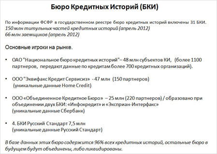 Расскажу о значимых сделках. Во-первых, это сделка между Сбербанком, компанией Experian и группой «Интерфакс» по слиянию кэптивного БКИ Сбербанка «Инфокредит» и БКИ «Экспириан-Интерфакс». В результате бюро стало третьим по размеру участником рынка. Во-вторых, поглощение аффилированным с банком «Восточный» Восточным бюро кредитных историй (Хабаровск) регионального игрока - Республиканского бюро кредитных историй (Уфа). Делалось это для выхода банка «Восточный экспресс» на местный рынок Башкирии. В 2011 году одно из крупнейших в РФ бюро - НБКИ, в свою очередь приобрело Восточное бюро кредитных историй.