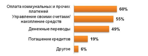 Кроме того, как выяснилось по результатам исследования, 46% жителей российских городов регулярно пользуются банковскими услугами в интернете. В том числе 17% заявляют, что пользуются он-лайн банкингом раз в неделю и чаще, а 29% заходят в свой банковский он-лайн кабинет один или несколько раз в месяц. Наиболее активные пользователи подобных услуг - респонденты мужского пола, в возрасте от 25 до 34 лет, с высоким уровнем доходов.
