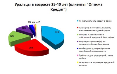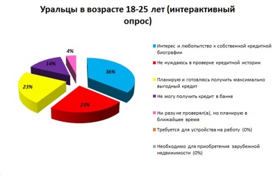 Главным мотивом, побуждающим уральскую молодёжь к проверке кредитной истории, стало собственное любопытство к данномуновому для России веянию последних двух лет - 36%особо интересующихся из общего числа опрошенных. Такая позиция не удивительна для современной аудитории, прогрессирующей во всех аспектах жизни мегаполиса, в том числе и в вопросах развития финансовой грамотности. Старшее поколение любопытных составило всего 18%, для которых проверка кредитной истории не представляется необходимой «здесь и сейчас». Чаще всего данная категория потенциальных заёмщиков обращается к бесплатной услуге получения данных из бюро кредитных историй, доступной каждому жителю РФ один раз в году.Основополагающей целью изучения кредитной биографии для уральцев в возрасте 25-45 лет стала насущная проблема - 41% респондентов живого опроса просто не могут получить кредит в банке по различным обстоятельствам, неотделимым от кредитного досье.