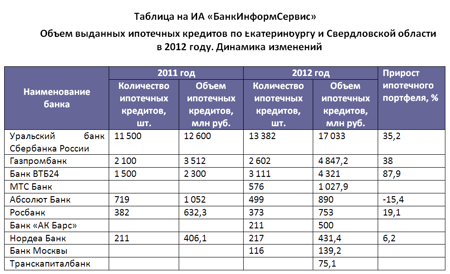 В 2012 году развитие рынку ипотечного кредитования в Свердловской области обеспечили цены на жилье, вернувшиеся на докризисный уровень, и активное соперничество банков за заемщика. Совокупный ипотечный портфель банков среднего Урала увеличился в 1,5 раза. От текущего финансового года аналитики ждут стабилизации ипотечного рынка, сокращения спроса и, как следствие, нового витка конкуренции. Ставки, по мнению экспертов, вырастут до 13,3%, но уже во втором полугодии могут пойти на снижение