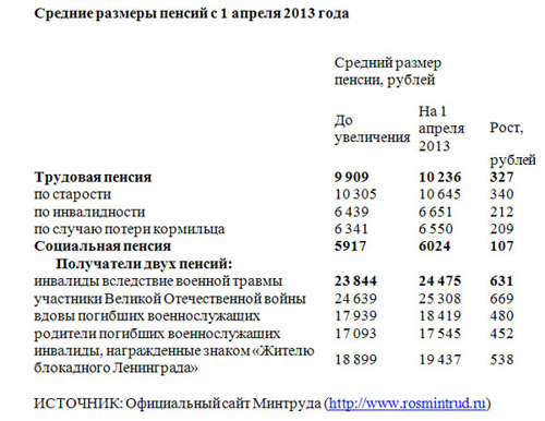 По данным Минтруда, повышение размеров трудовых пенсий коснется почти 37,4 млн человек, получающих на дату перерасчета трудовые пенсии. В результате дополнительного увеличения на 3,3% средний размер трудовых пенсий увеличится на 327 рублей. Расходы на проведение дополнительного увеличения с 1 апреля 2013 года на 3,3% размера страховой части трудовой пенсии по старости и размеров трудовой пенсии по инвалидности и трудовой пенсии по случаю потери кормильца составят 111,93 млрд рублей до конца 2013 года. Ранее, с 1 февраля 2013 года трудовые пенсии уже были проиндексированы на 6,6%.