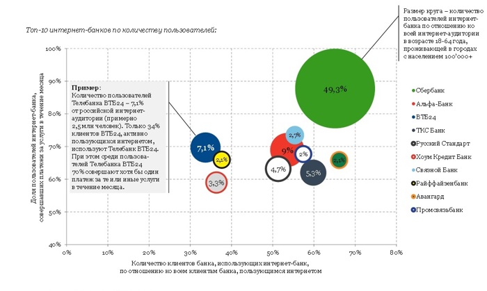 Наиболее популярной системой в России является Сбербанк Онлайн - 74% всех пользователей интернет-банкинга в России (49% российской интернет-аудитории, или 17,3 млн человек) используют эту систему. В первую пятерку популярных интернет-банков также вошли системы Альфа-Клик Альфа-Банка, Телебанк ВТБ24, интернет-банки ТКС Банка и Банка «Русский Стандарт».