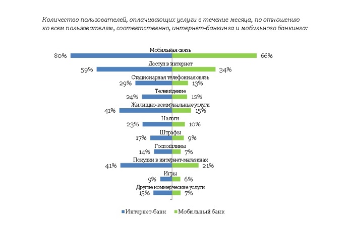 Аналитики отмечают, что активность пользователей достаточно высокая. 68% пользователей совершают за месяц хотя бы один платеж за коммерческие услуги или в бюджет РФ, а 66% - хотя бы раз перевод межу собственными счетами или другим лицам. При этом более 40% пользуется не одним, а сразу несколькими интернет-банками.