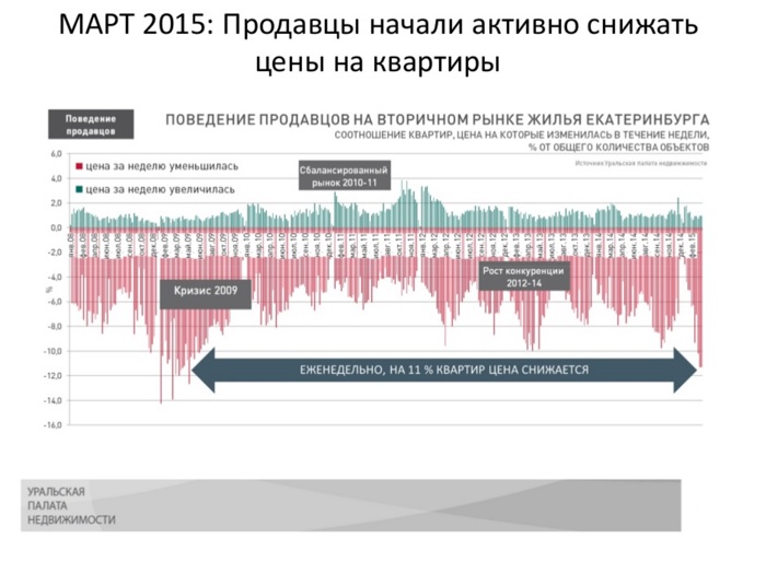 Такое положение дел вынуждает продавцов снижать цены. И если ранее на торг шли уже в процессе обсуждения конкретной сделки, и конечная цена продажи не влияла на статистику УПН, то теперь продавцы идут на дисконт еще до того, как найдут покупателя. Наиболее заметно это стало в марте. Еженедельно 11% выставленных на продажу квартир теряют в цене.