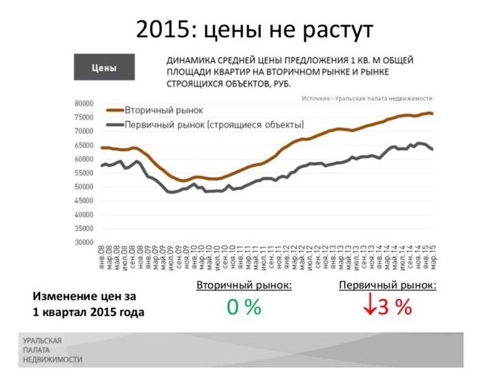 В отличие от объема предложения цены на жилье в этом году существенной динамики не демонстрировали. Стоимость квадратного метра почти не изменилась с декабря прошлого года и на 30 марта 2015 года составила 76 199 рублей.