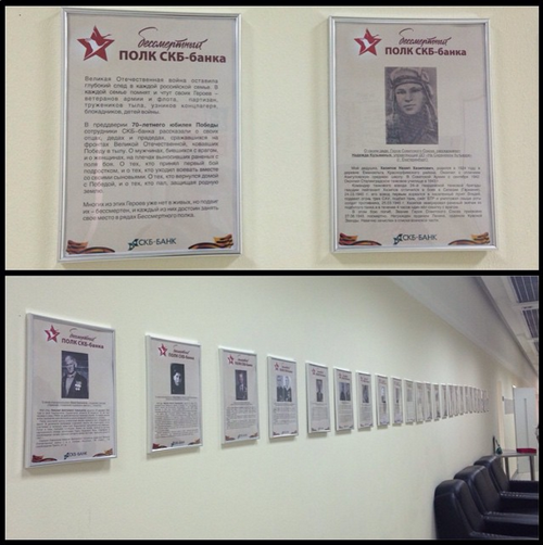 В головном офисе СКБ-банка на ул. Куйбышева, 75 открылась галерея героев «Бессмертного полка». Истории и фотографии своих отцов, дедов и прадедов в рамках проекта «Бессмертный полк» прислали сотрудники СКБ-банка со всей страны - от Санкт-Петербурга до Комсомольска-на-Амуре. В галерее - два Героя Советского Союза, кавалер сразу трех орденов Красной Звезды, летчики и танкисты, пехотинцы и подпольщики...