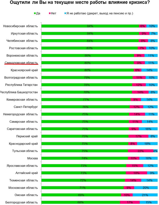 На уральцах очень остро сказались негативные последствия после наступления кризиса 2014 года. Около 80% свердловчан почувствовали на себе отрицательное влияние, связанное с экономической ситуацией в стране, в то время как в целом по России этот показатель - 76%. Сильнее досталось Новосибирской, Иркутской, Ростовской областям и Южному Уралу. Тут показатель достиг 84%.