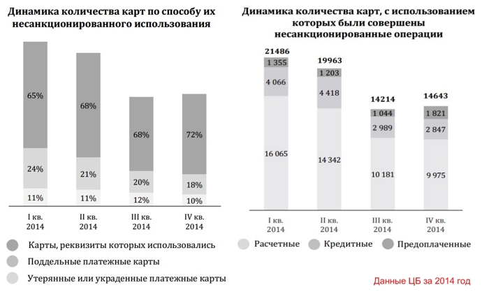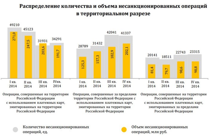 «Наблюдается снижение как количества, так и объема внутрироссийских несанкционированных операций примерно на 30% к концу 2014 года по сравнению с его началом.. Это свидетельствует о перераспределении географического характера операций, в том числе благодаря переходу значительной части эмитентов и эквайреров на эмиссию и обслуживание карт с микропроцессом»,- делают вывод составители обзора.