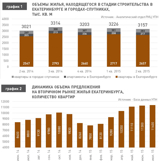 Застройщики продолжают выводить новые объекты на первичный рынок жилья. Несмотря на общий спад спроса, инерция не позволила девелоперам остановить этот процесс, замедление стало фиксироваться только во втором квартале 2015 года. «Общий объем строящихся объектов на рынке жилья «большого Екатеринбурга» составляет сегодня 3,157 млн. кв. м. Это лишь немногим ниже рекордных показателей предыдущих трех кварталов. Из этих квадратных метров квартиры в новостройках составляют только 2,657 млн. Другие 217 тыс. кв. м - апартаменты, относительно новый сегмент, который в последние годы активно развивается и уже отвлекает на себя покупателей. Еще 283 тыс. кв. м - квартиры в пригородных поселках и городах-спутниках», - указано в пресс-релизе УПН.