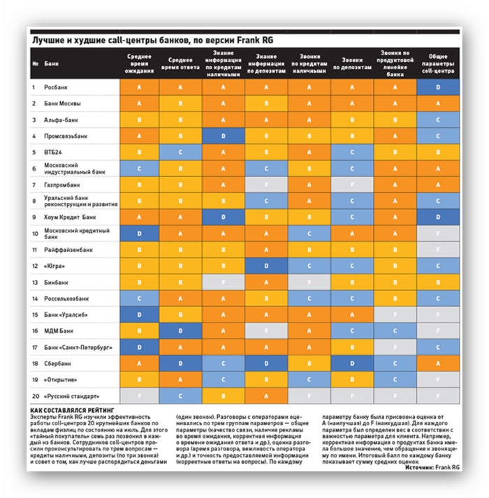 Рейтинг лучших и худших coll-центров банков, по версии Frank RG: