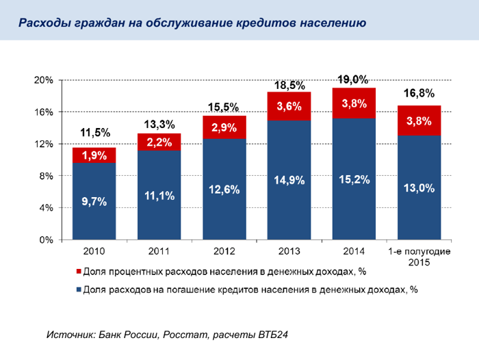 В этих условиях население стало ответственнее подходить к банковским долгам. Мы видим, что по итогам первого полугодия доля расходов россиян на обслуживание банковских кредитов снизилась. Если еще в конце 2014 года на выплату различных кредитов у россиян уходило 19% личного бюджета, то сейчас уже 17%. Это уровень 2012-2013 годов.