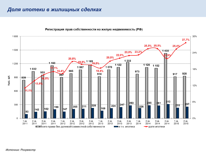 Основным драйвером розничного кредитования второй год подряд остается ипотека. Несмотря ни на какие кризисы и даже девальвацию, она продолжает уверенно расти. По итогам сентября, рост составил 32%, за половину октября - уже 15%. Во втором квартале почти 28% всех сделок с недвижимостью, которые совершаются в России, проходят с использованием ипотеки. Еще пять лет назад их было около 10%. Но даже нынешнее значение - еще не предел, в развитых странах доля ипотечных сделок достигает 70-80%.