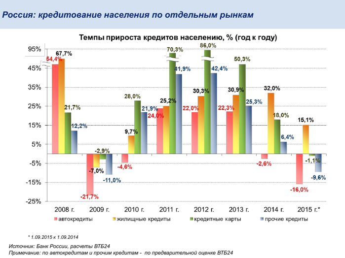 Остальные кредитные продукты пока показывают отрицательную динамику, особенно сложная ситуация в автокредитовании (падение на 16% по сравнению с сентябрем прошлого года). Но есть и хорошая новость: стабилизировались продажи автомобилей. Мы вернулись на показатели пятилетней давности, среднемесячный объем продаж новых автомобилей очень мал, но он не падает и это уже хорошо.