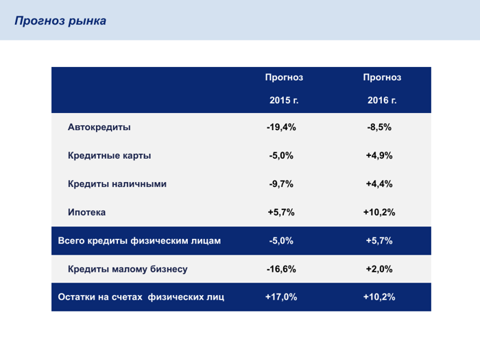 Мы нащупали дно. Это плохо. Но есть возможность от него оттолкнуться - и это хорошо. Мы надеемся, что в 2016 году банковский сектор России выйдет в рост по всем ключевым показателям. Драйвером, как я и говорил, будет ипотека - за 2016 год, по нашим прогнозам, рынок вырастет на 10,2%. Потихоньку будет восстанавливаться потребительский спрос, а вслед за ним пойдут в рост и кредиты наличными (+4,4%), кредитные карты (+4,9%). После существенного падения начнет восстанавливаться и кредитование малого бизнеса (+2%). Пожалуй, единственным исключением будут автокредиты - сегмент, по-прежнему, будет показывать отрицательную динамику, но падение будет уже не столь существенным (-8,5%).