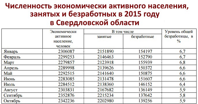 Свердловская область по уровню безработицы показывает более обнадеживающую динамику. С начала года этот показатель снизился на 0,8%. По данным Свердловскстата, если в начале 2015 года он был на уровне 6,7% (154,2 тыс. человек), то в октябре количество безработных сократилось до 5,9% - 139 256 незанятых . А в октябре 2014 года таких было 142 тыс. (6,2%) человек.