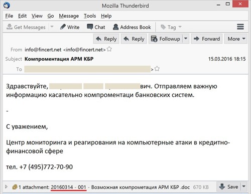 15 марта десятки российских банков подверглись целевой атаке - рассылке вредоносных писем на электронные адреса сотрудников. Особенностью атаки стало то, что киберпреступники впервые выдавали себя за FinCERT - специальный отдел в структуре Центрального Банка РФ, созданный для информирования банков об инцидентах информационной безопасности в финансовой сфере.