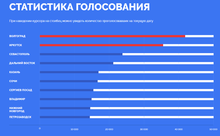 Однако по факту уже на второй день голосования Иркутск «согнал» со второго места Севастополь и продолжает увеличивать свой отрыв. К настоящему моменту у столицы Восточной Сибири уже в полтора раза больше голосов, чем у идущего третьим Севастополя (точные цифры можно посмотреть ниже).