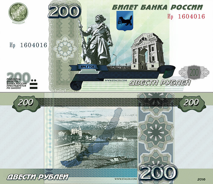 Весной художники из «Студии агрессивного дизайна» разработали проект 200-рублевой купюры с Иркутском. На лицевой стороне они изобразили достопримечательности города - Московские ворота и памятник основателю Иркутска Якову Похабову, а на оборотной - берег Байкала с наложенным на картинку контуром озера.