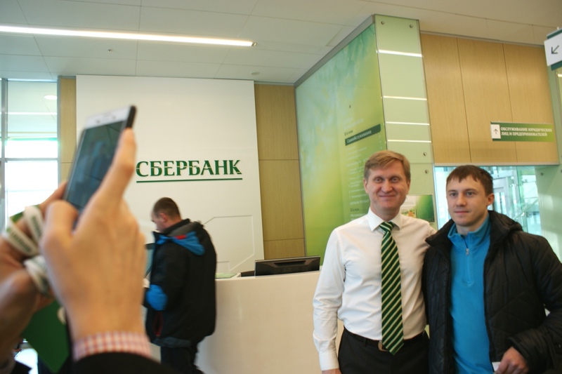 Незаметно за женщинами вырастает целая очередь, жаждущих селфи со звездой. Тут и молоденькие девчушки, и взрослые мужчины, и студенты, и школьники. Не смогли удержаться даже сотрудники - к Рожкову вереницей идет делегация работников разного ранга от операционисток до топ-менеджеров.