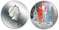 Если вам больше нравится видеть деда и внучку в паре - обратите внимание на монету «С Новым годом!», изготовленную в Гане специально для россиян. Дед Мороз и Снегурочка здесь изображены на фоне курантов Спасской башни и ёлки.