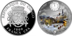 Естественно, для новогоднего подарка подойдут и монеты, напоминающие о зиме в целом. Например, красочные «Русская тройка» из Токелау (аверс монеты обрамлен национальным узором этой территории, а вовсе не инеем, как можно подумать!) или «Русская зима» из Конго (тут есть отсылка к празднику - часы, замершие на без пяти минут двенадцать).