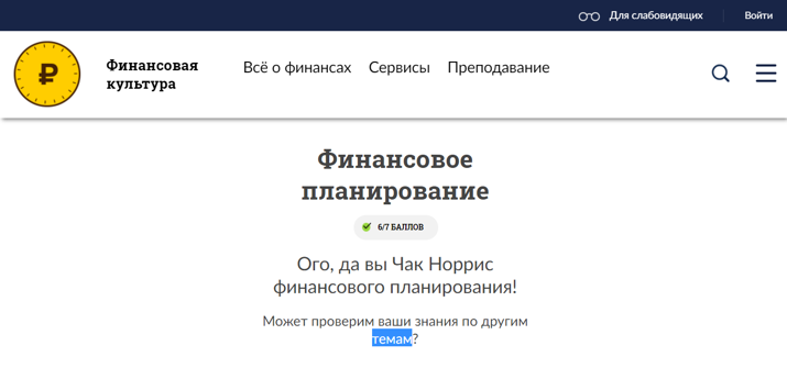 Навигация сайта удобна, дизайн приятен. Имеется версия для слабовидящих. Главную страницу открывает красочная линейка, представляющая материалы разных типов - статью, видео, тест. Детище ЦБ радует даже в мелочах - картинки и образовательные видеоролики выполнены с ненавязчивым юмором. А небольшие тесты, сопровождающие каждую из рубрик, составлены качественно (это особо приятно, если вспомнить ужасные тесты недель финансовой грамотности) и тоже не без юмора.