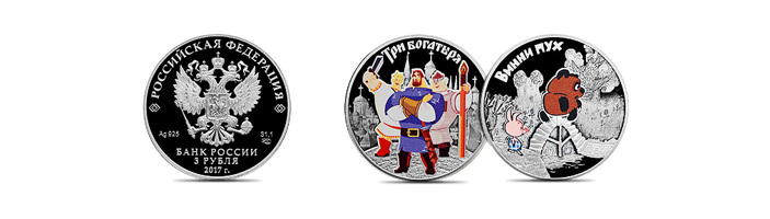 Есть и третий вариант тех же монет - серебряные и тоже цветные. Их номинал и тираж стандартен для серебряных монет - 3 рубля и 3 тысячи экземпляров. Следующие монеты «мультяшной» серии также будут выходить в трех вариантах - недрагоценном, цветном недрагоценном и цветном серебряном. В 2018 году планируется выпуск еще одного «мультика».