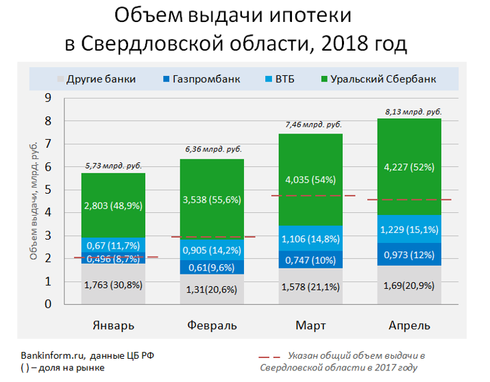 Свердловская область по-прежнему вдвое (на 94%, если быть точным) опережает прошлогодние показатели. В апреле на Среднем Урале выдано 4,3 тыс ипотечных ссуд на общую сумму в 8,13 млрд рублей.